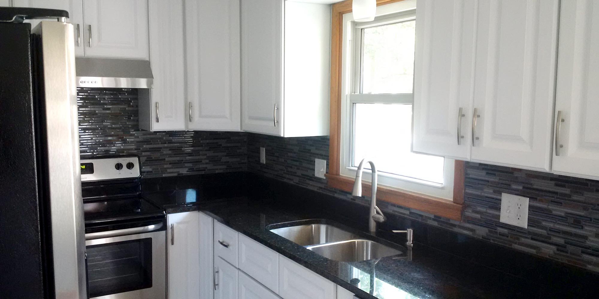 In this home, we replaced all of the existing cabinets with new semi-custom cabinets, granite countertops and new appliances. We chose a black and gray backsplash to compliment the black granite and really pull in the white cabinetry. The result was a dramatic change to a modern kitchen.