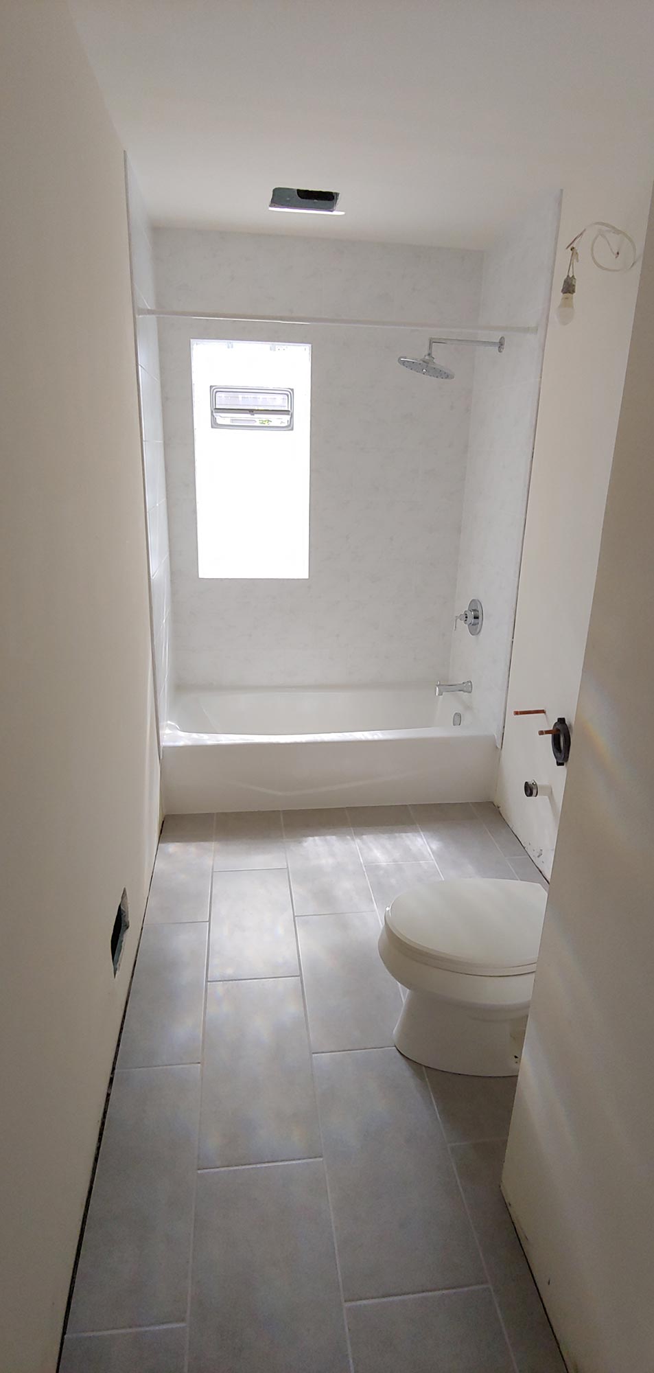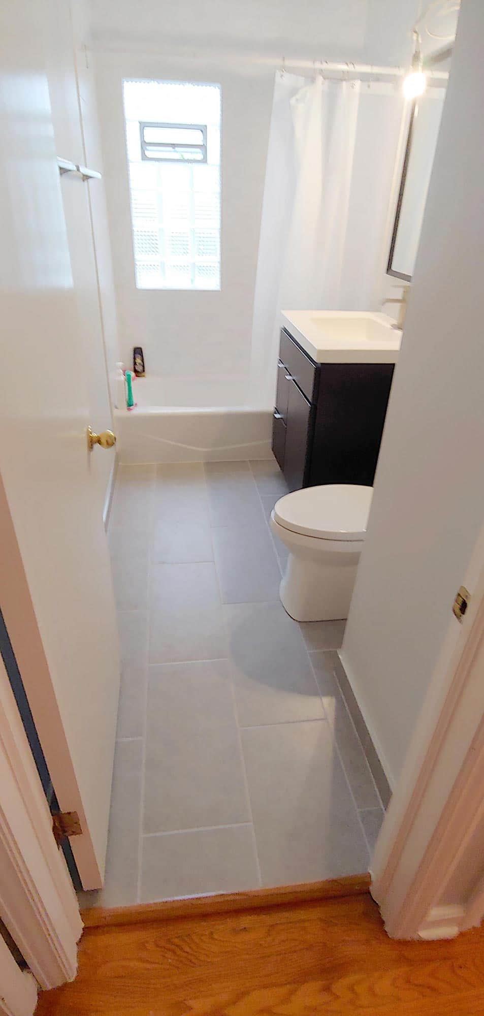 We installed the vanity once the tub surround and tile floor were completed.