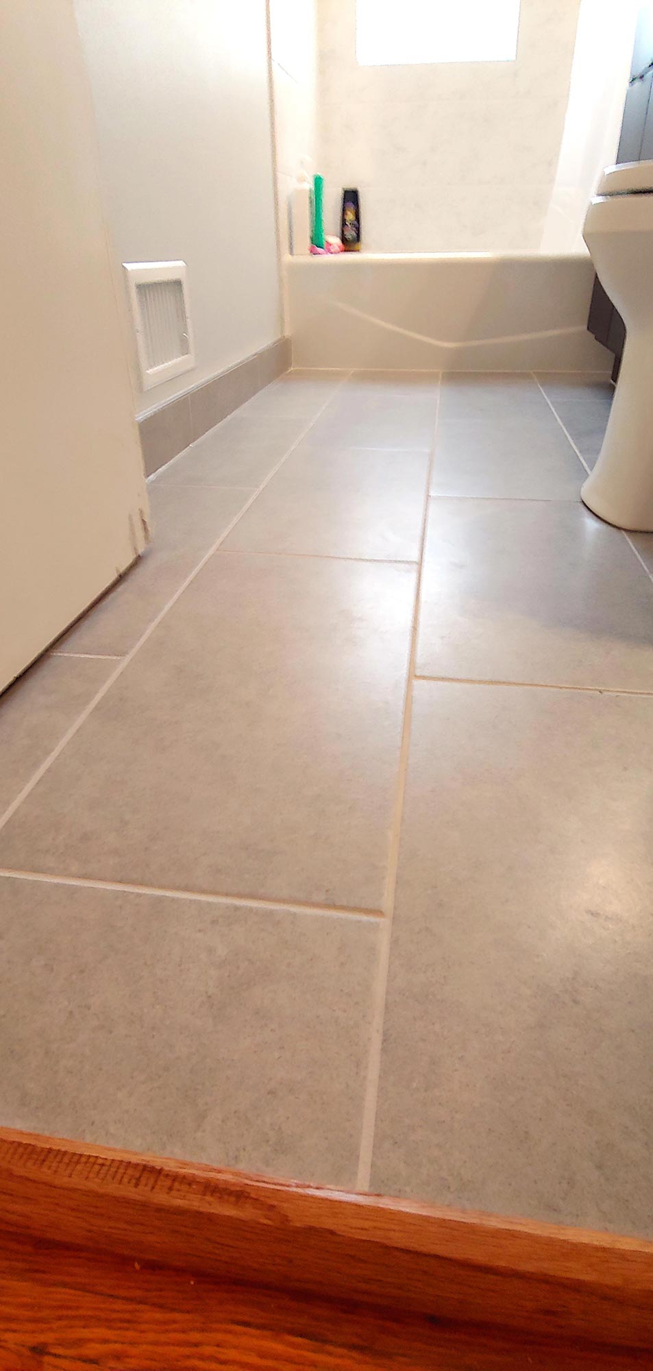 Our crew tore out the old tile floor and replaced much of the subfloor due to the existing tub not being waterproofed correctly. We sealed the floor and poured self leveling cement to make sure everything was even and level, then used an uncoupling membrane on top of that.